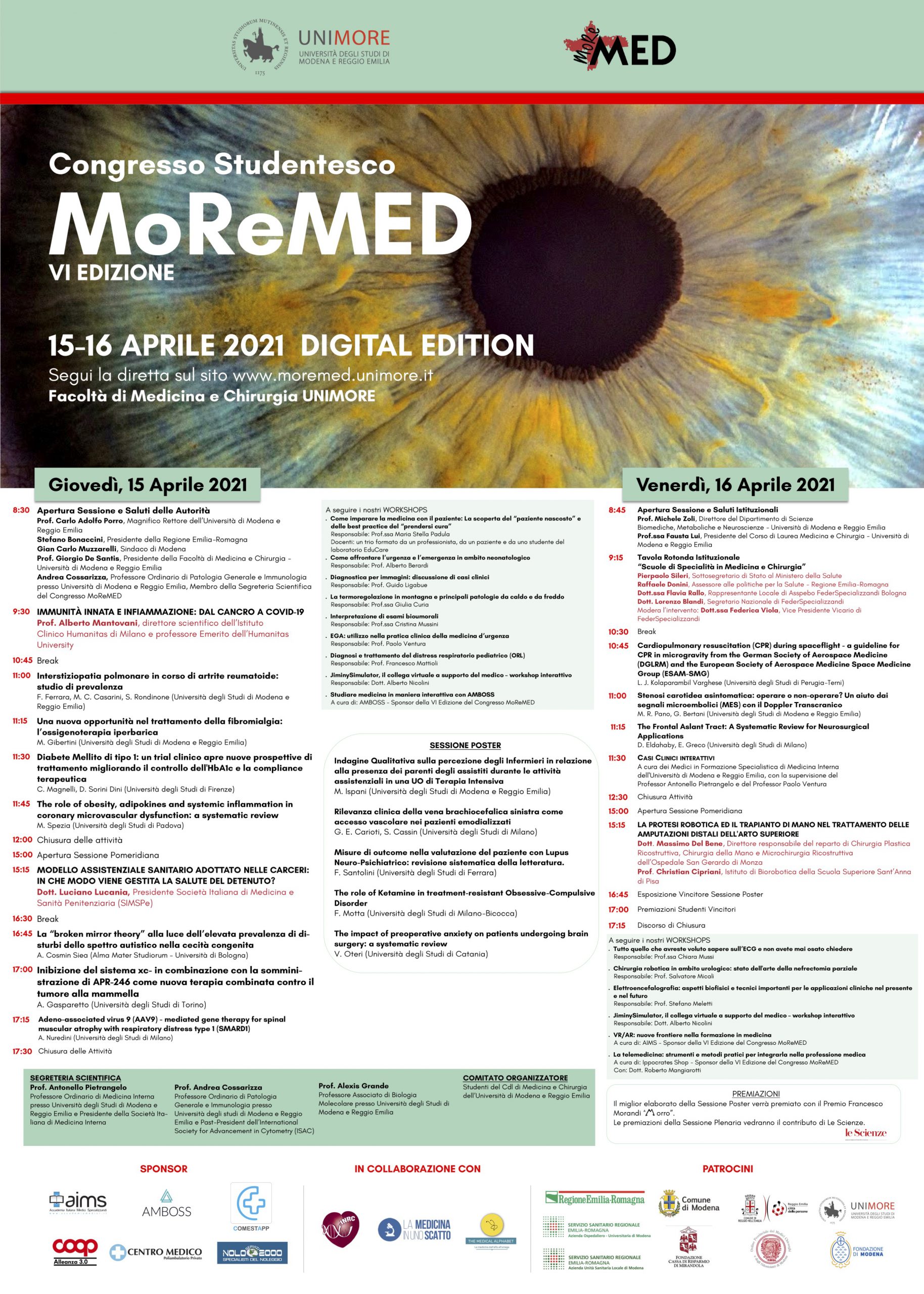 La VI Edizione del Congresso Studentesco MoReMED ha avuto luogo nelle giornate di Giovedì 15 e Venerdì 16 Aprile 2021. A causa della pandemia da COVID-19, l’evento è stato convertito totalmente in formato streaming.