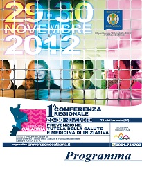 Lamezia Terme (CZ), 29-30 Novembre 2012. La Regione Calabria, con deliberazione n°851 del 29 dicembre 2010 ha approvato il “Piano Regionale di Prevenzione 2010/2012” predisponendo un Piano operativo composto da n. 70 programmi/progetti riguardanti le quattro macroaree del PNP 2010-2012 (Intesa Stato/Regioni del 29 aprile 2010):