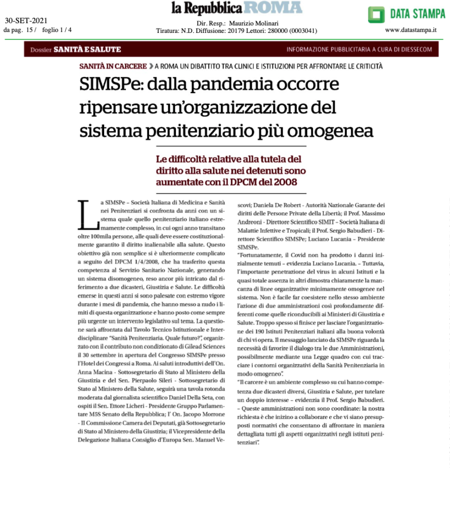 È iniziata questa mattina la XII Agorà Penitenziaria organizzata dalla Società Italiana di Medicina e Sanità Penitenziaria. In anteprima per voi l’articolo di Repubblica che troverete in edicola e online.
